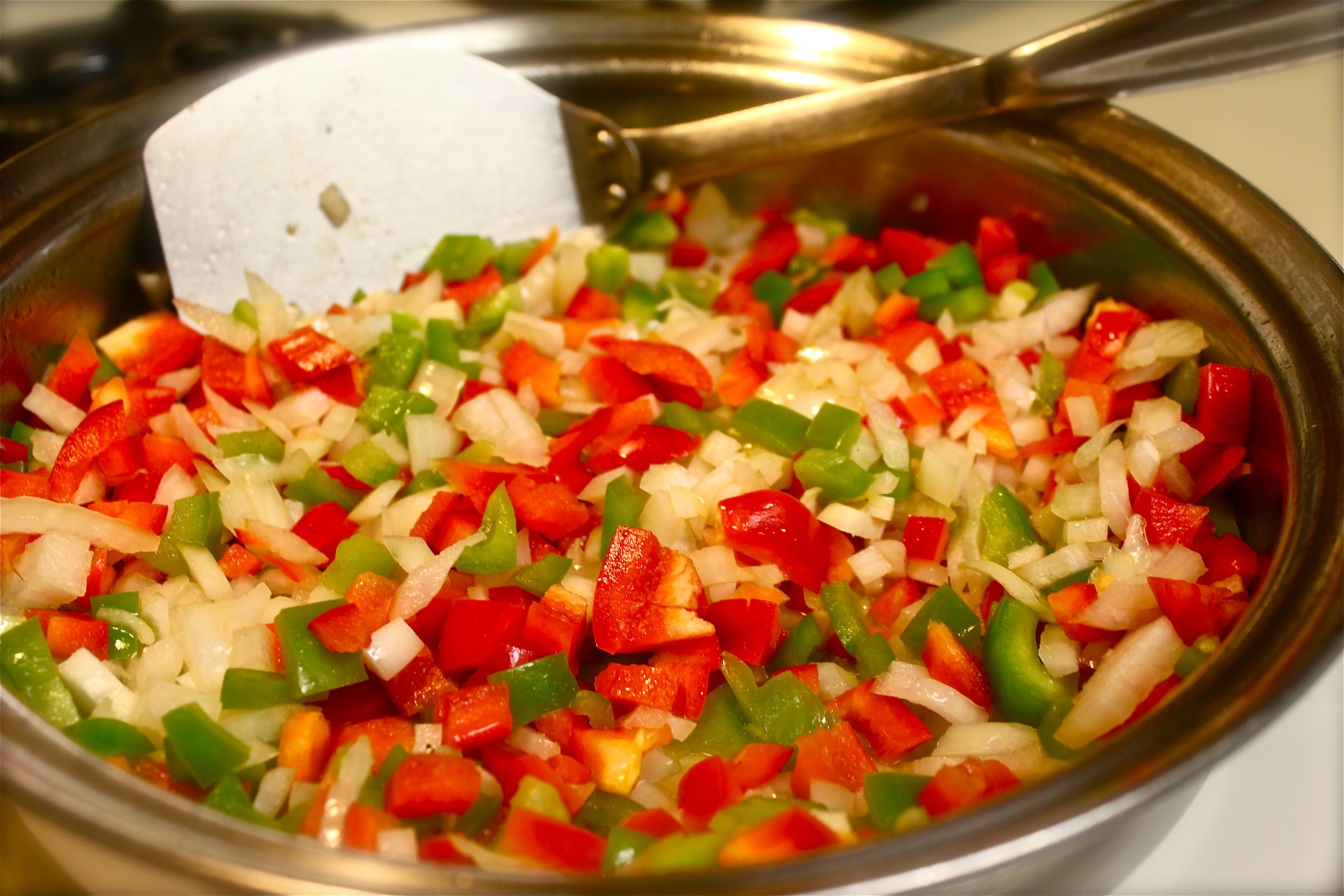 Lightly coat large frying pan with olive oil, turn heat to medium, and cook diced onion, bell pepper, and celery for 10 minutes, stirring occasionally.