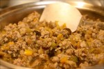 Reduce heat to medium, add ground turkey to the vegetable mixture. Season with garlic salt and Mrs. Dash Extra Spicy (to preference). Allow to cook about 10 minutes, stirring occasionally.